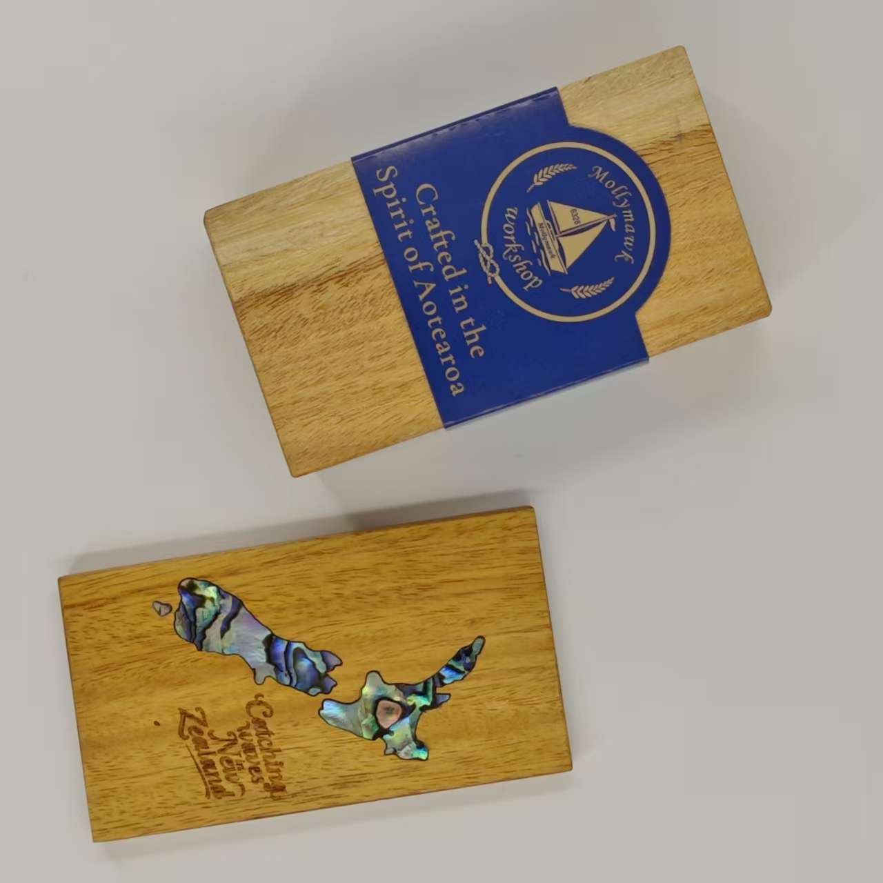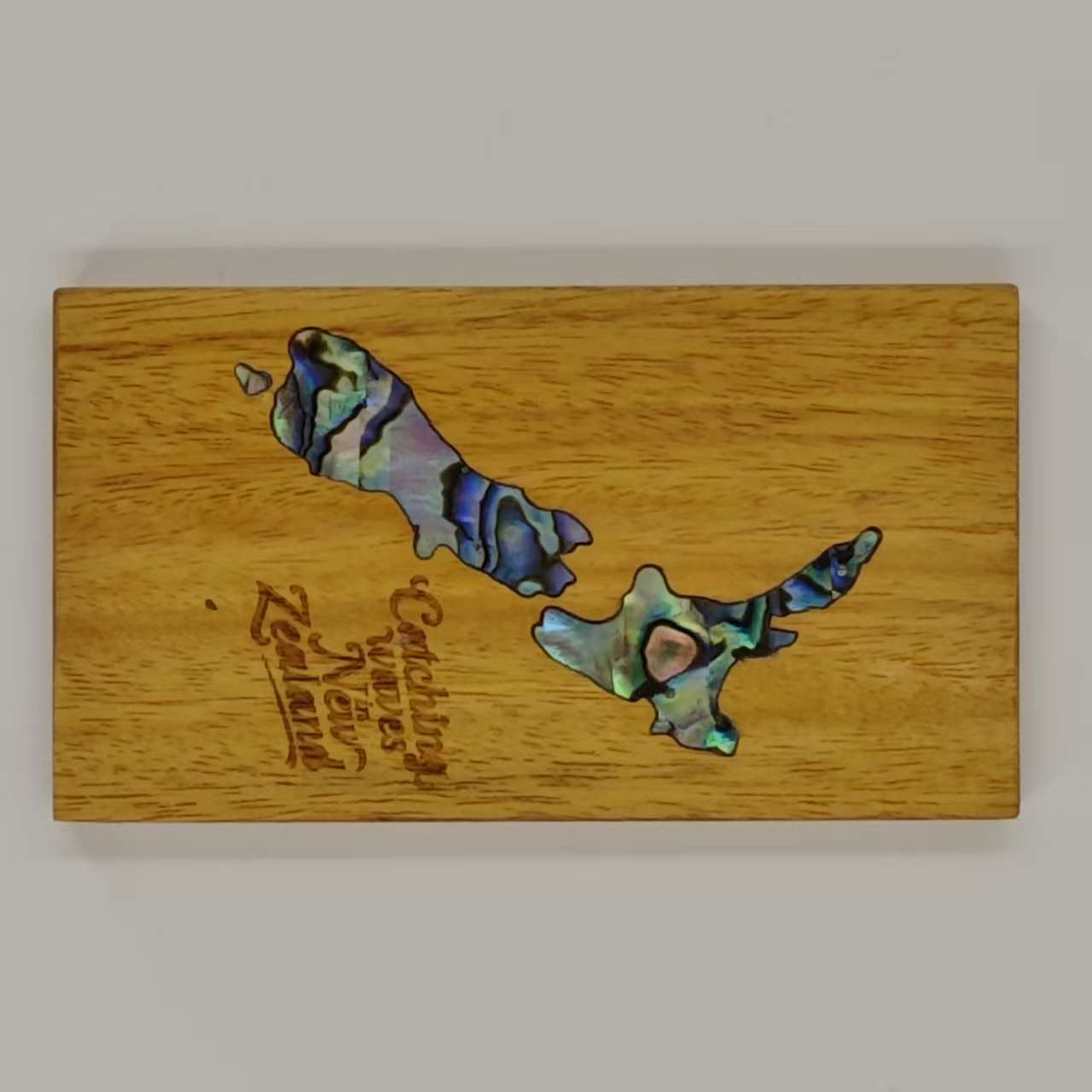New Zealand map fridge magnet with pāua shell inlay.
