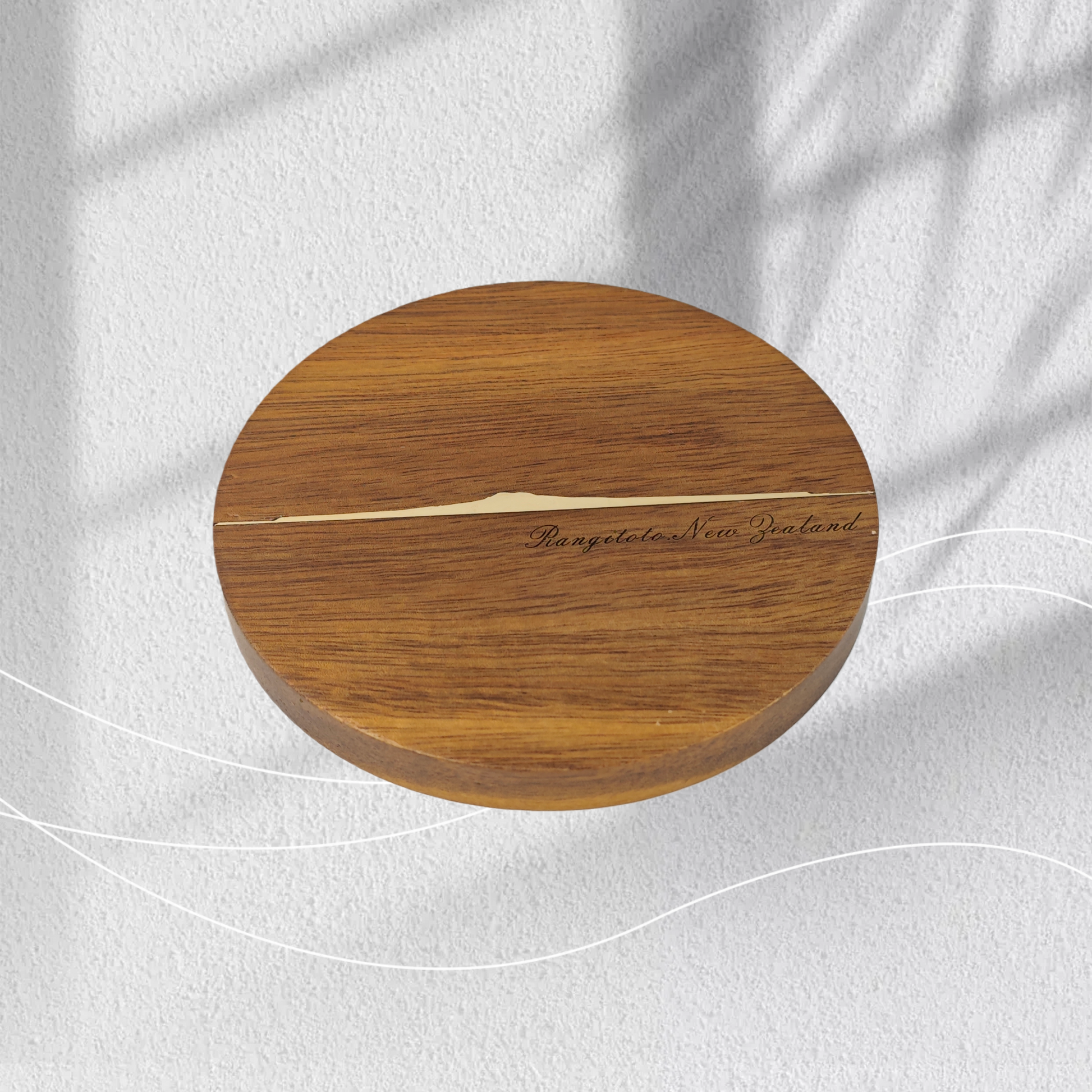 Round wood coaster set featuring brass Rangitoto Island inlay. A tribute to Auckland's iconic volcanic landmark.